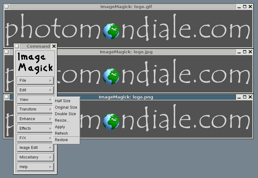 Most of the tools work from the command-line, at a shell prompt, and also, of course, from scripts and anywhere else you can run a program. ImageMagick has multiple APIs — for C, Ch, C++, Java, Lisp, Pascal, Perl, PHP, Python, Ruby, and Tcl/Tk — but we’ll cover the command-line here.