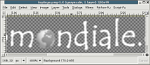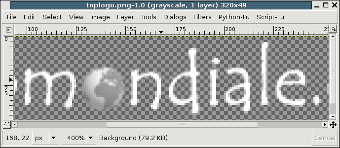 It may be easier to create logos in an interactive editor. Figure Five shows part of a logo with text and graphics in a GIMP window, magnified 400% to make pixel-by-pixel editing easier. The checkerboard background helps you see transparent and partly-transparent pixels.