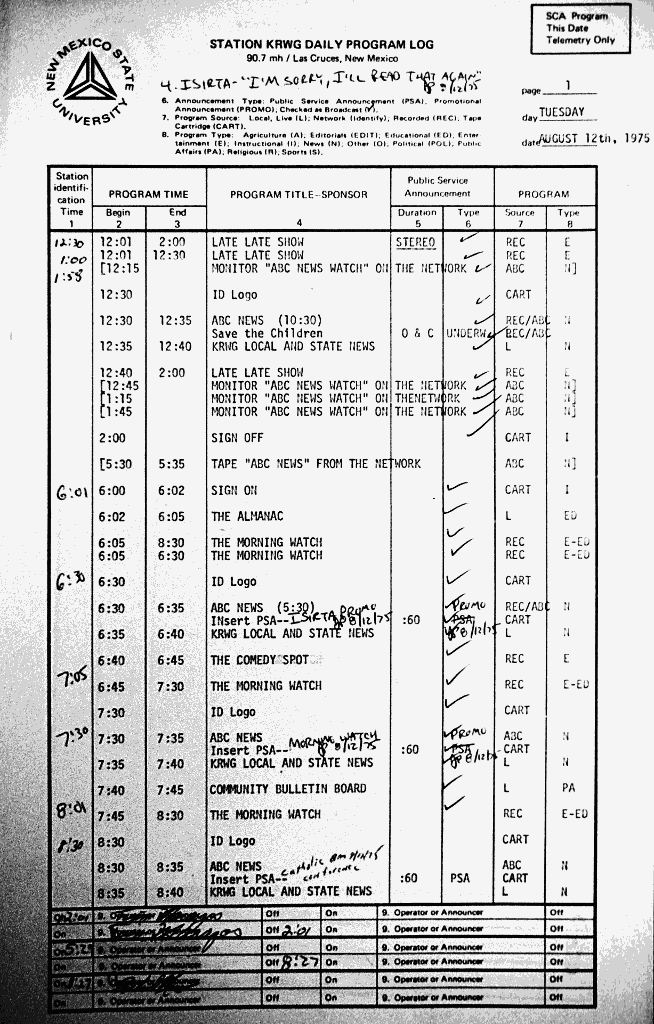 My first radio work was at KRWG-AM (later KNMS) and KRWG-FM at New Mexico State University in Las Cruces. I was there from 1973 to 1975. The AM station had a Top-40 formet during the daytimes and a “progressive rock” format at night; it tried to be as much like a commercial station as possible, as good training for “real-world” radio work. The FM station was a National Public Radio affiliate that also played classical music.